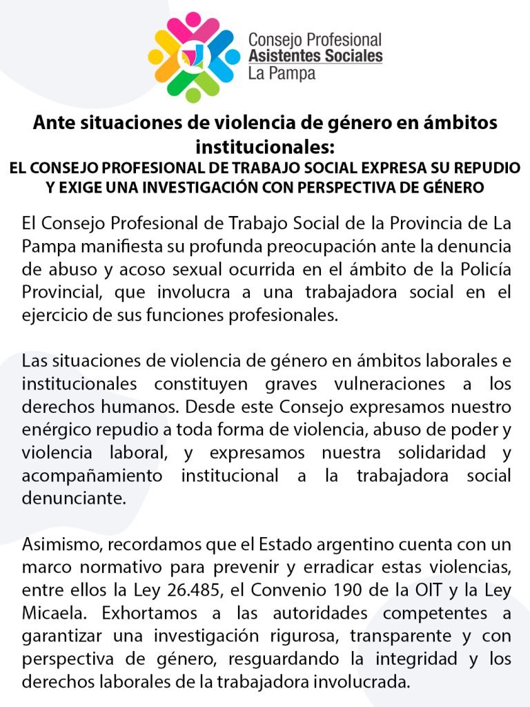 Desde este Consejo Profesional expresamos nuestro enérgico repudio a toda forma de violencia de género, abuso de poder y violencia laboral. Reafirmamos el compromiso del Trabajo Social con la defensa de los derechos humanos, la igualdad de género y la dignidad de las personas en todos los ámbitos institucionales.