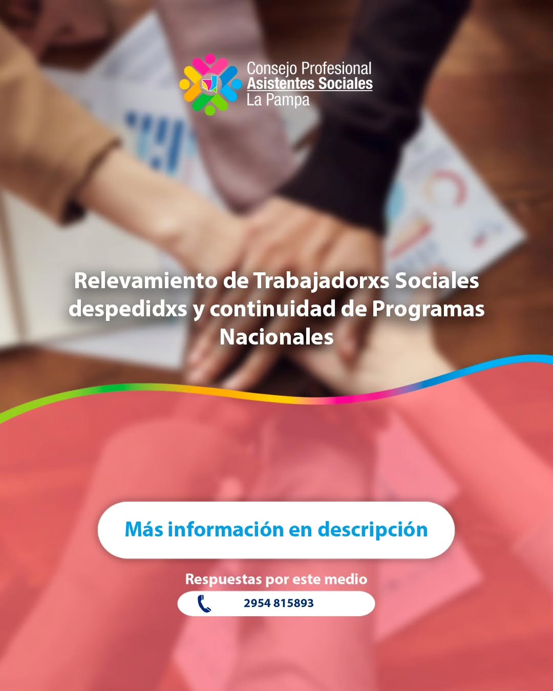 📢 Relevamiento de trabajadorxs sociales despedidxs y continuidad de programas nacionales Desde el Consejo Profesional de Asistentes Sociales de La Pampa, nos sumamos a la iniciativa de relevar la situación de lxs colegas despedidxs entre …