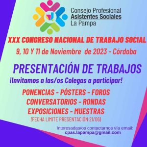 Estimadas/os Matriculadas/os! Por la presente, invitamos a Uds. a participar del “XXX Congreso Nacional de Trabajo Social y VI Encuentro Argentino y Latinamericano – Trabajo Social: resistencia y exigibilidad de derechos en la reconfiguración de escenarios sociales”, a desarrollarse los días 9,10,11 de noviembre de 2023 en Córdoba – Argentina. …