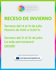 Receso invernal: modificación en la atención del Consejo Informamos a matriculadxs y a la comunidad en general que, con motivo del receso invernal, el Consejo Profesional de Asistentes Sociales de La Pampa establecerá un esquema de atención reducido y suspensión temporal de actividades. 📅 Semana del lunes 14 al viernes …