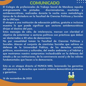 Acompañamos y difundimos el comunicado realizado por nuestros colegas de la Provincia de Mendoza. ¡Ya dijimos Nuca Más! Democracia para siempre.