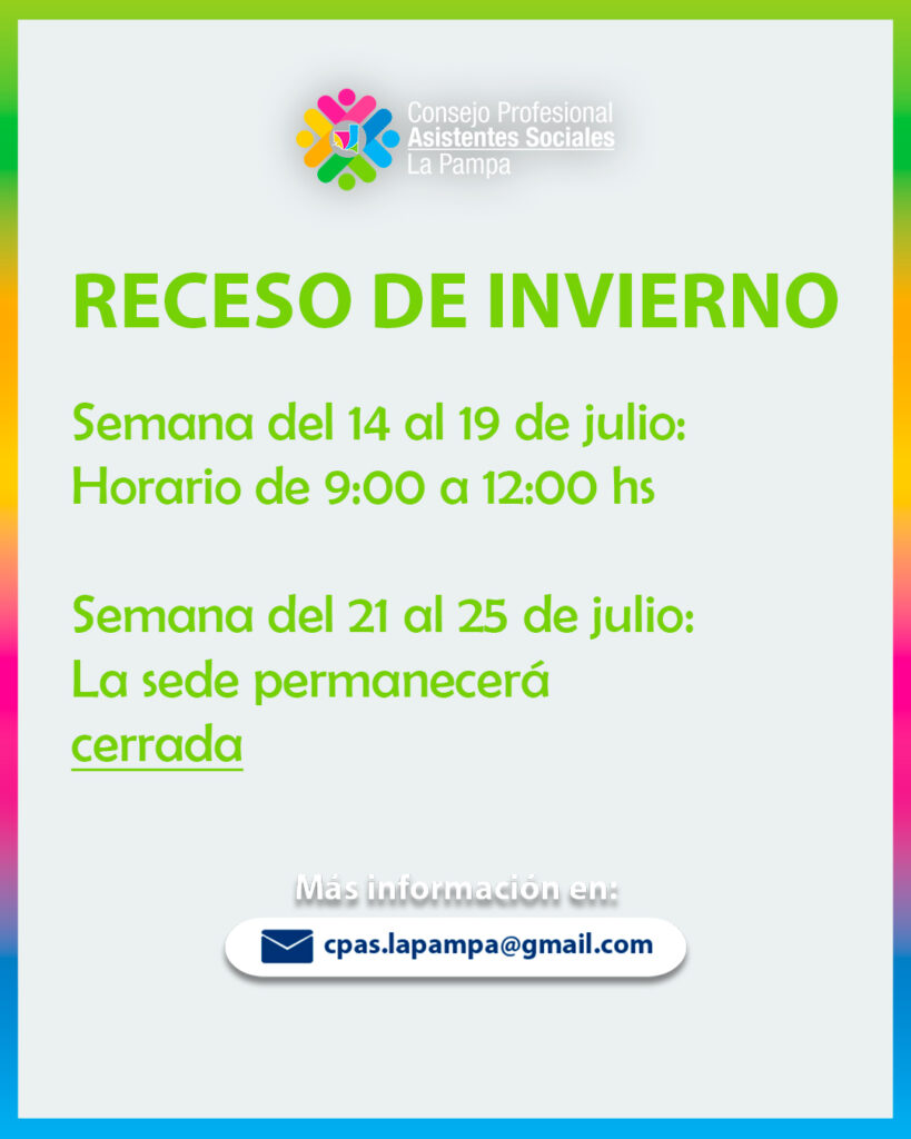 Informamos a matriculadxs y a la comunidad en general que, con motivo del receso invernal, el Consejo Profesional de Asistentes Sociales de La Pampa establecerá un esquema de atención reducido y suspensión temporal de actividades.
